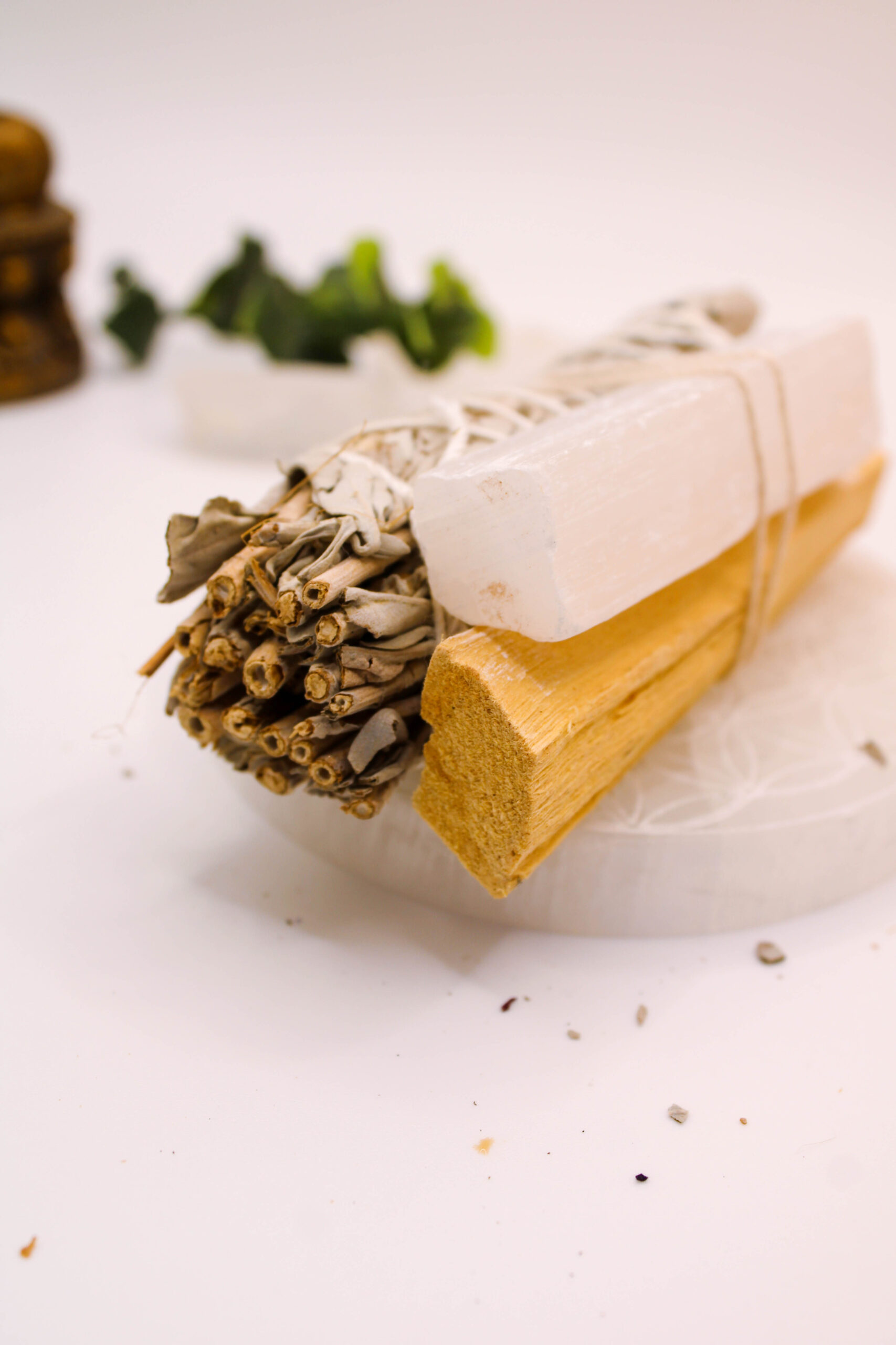 Este poderoso atadillo de salvia blanca, palo santo y selenita combina tres aliados sagrados en un solo ritual de luz: