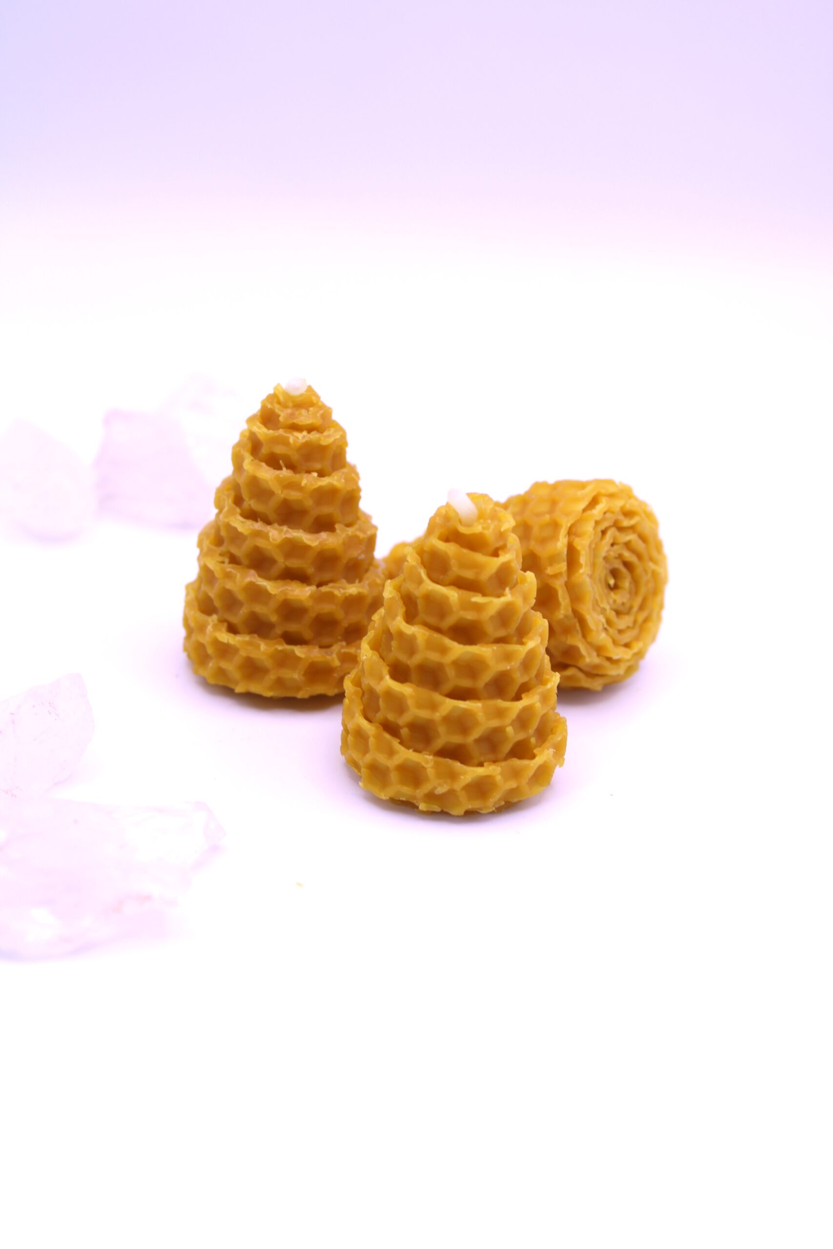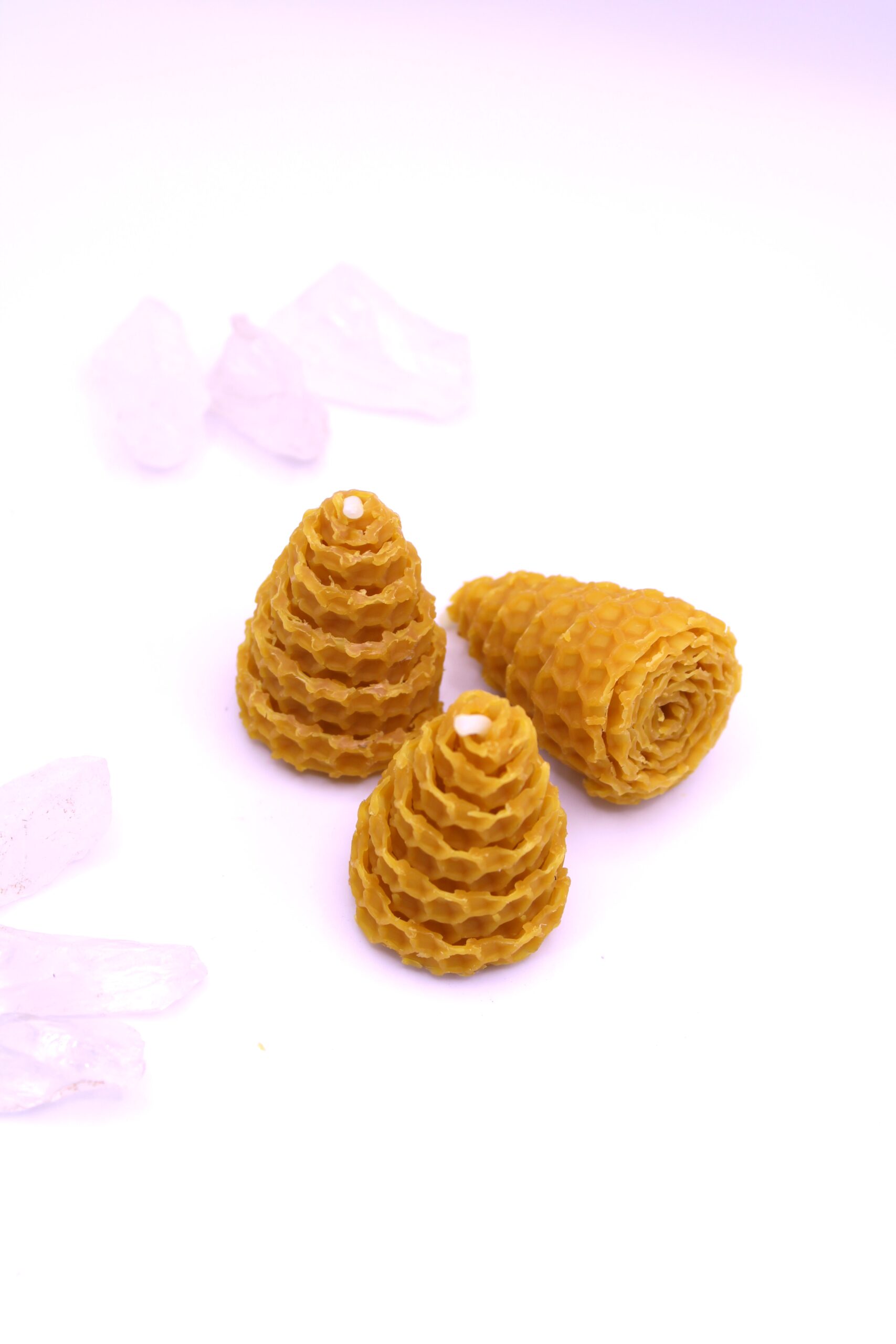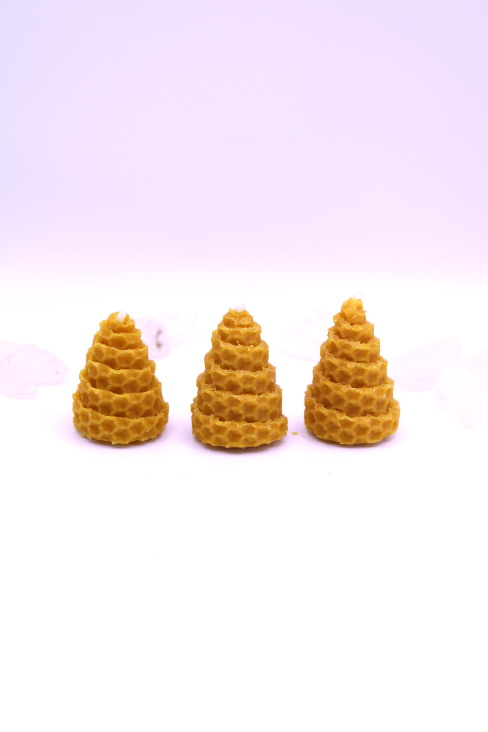 Este pack incluye 3 conitos de miel artesanales, con unas medidas aproximadas de 5 cm de alto y 3 cm de diámetro, elaborados con cera natural. Su forma cónica concentra la energía y simboliza la dirección ascendente de la intención: desde la base firme hacia la manifestación.